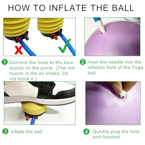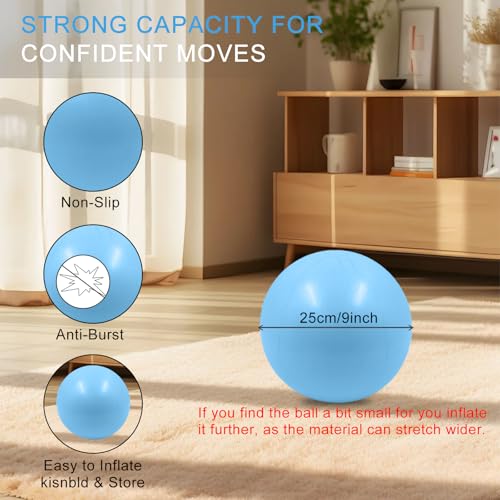 9 Inch Size & Effortless Inflate/Store: These 9 inch exercise balls inflate quickly with the included pump/straw, deflate easily for compact storage or travel. Let the mini yoga ball rest a few days after first inflation for optimal firmness.