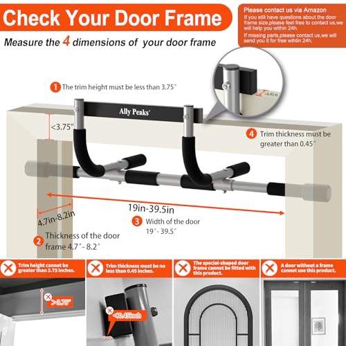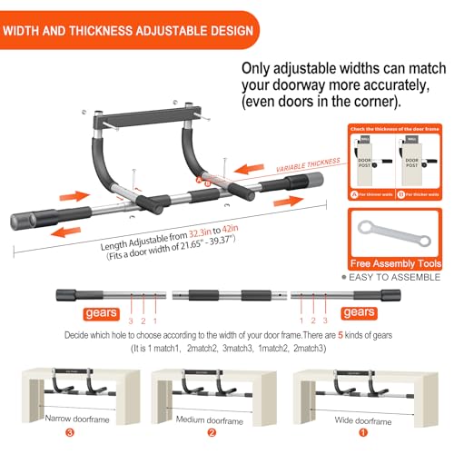 UPDATED WIDTH ADJUSTABLE DOORWAY PULL UP BAR:Real adjustable width design can match your doorway more accurately, even doors in the corner. This door frame pull-up bar has 5 levels of adjustment for width and 2 levels of adjustment for thickness can be precisely mounted on any standard 21.65 “- 39.37″ wide doorways,depth of 4.7″-8.27”,Acceptable trim height up to 3.75″,easy to install and remove. Design does not necessitate screwing into frame making the assembly easy to remove.