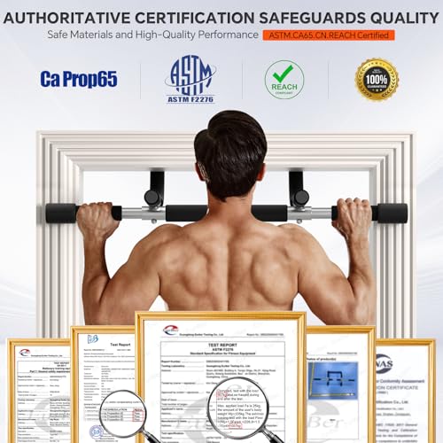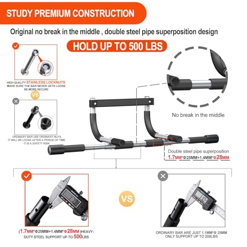 HEAVY DUTY CONSTRUCTION,HOLD UP TO 500 LBS: The pullup bar make from 1.7mm thickened chrome steel.Original no break in the middle , double steel pipe superposition construction.These features permit the 500lb weight limit.High quality lock nuts help prevent loosening of the assembly.The fine powder coating prevent rust and corrosion.High fiber foam handles provide a comfortable grip, anti-slip and wear resistance.