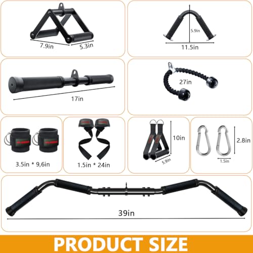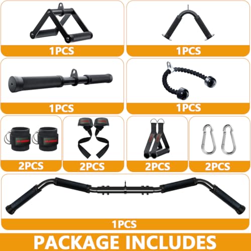 【What is in the box】Combo Includes 1x Tricep Rope, 1x V-Handle (Double D Handle), 1x V-Shaped Bar, 1x Straight Rotating Bar, 1x Lat Pull Down Bar, 2x Lifting Wrist Straps, 2x Ankle Straps, 2x Cable Machine Handles, and 2x Snap Hooks. These home gym accessories for men and women are designed to fit most cable systems