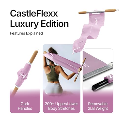 Elevate your fitness routine with the CastleFlexx Stretching Strap, the ultimate stretching equipment designed for superior performance and convenience. This versatile stretch out strap features 100% sweatproof silicone handles with super-grip tech, providing a secure and comfortable hold even during the most intense workouts. Perfect for use as a calf stretcher, back stretcher for lower back pain relief, or hip flexor release tool, this strap offers unmatched durability and effectiveness. At 2x lighter than luxury variants, the CastleFlexx workout strap is both portable and functional. Its lightweight design ensures ease of use, making it an excellent choice for a flexibility trainer. The non-removable weights deliver consistent resistance, ideal for those needing a reliable hamstring stretch strap or leg stretcher for flexibility. Engineered for full body strengthening, this stretch out strap supports a variety of stretches and exercises. Use it for a standing hamstring stretch with a bicep curl to target both the hamstrings and upper arms, or perform a lats stretch to enhance flexibility and release tension in your back. Designed for athletes and fitness enthusiasts up to 5’9″, it helps improve mobility and overall stretching performance. Whether you’re engaging in physical therapy, targeting tight hips, or performing calf stretches, the CastleFlexx mobility stretching strap integrates seamlessly into your workout regimen. Experience the benefits of a tool designed to enhance flexibility and aid in recovery, making every stretch count. Upgrade your fitness gear with the CastleFlexx Stretching Strap and take your training to the next level.