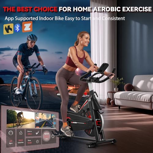 [Upgraded Exercise Bike & Reliable Brand] After years of research, WENOKER released this upgraded exercise bike. It has thicker heavy duty aluminum steel construction and updated 7-shaped front handlebar post knob which make sure the exercise bike sits firmly on the floor so it won’t rock or wobble while you ride. Sleek black and red styling will look chic in your home or workout space.[Smart App Support] Upgrade your workouts with stationary bikes for home. New Bluetooth support for Smart APP, riding with Kinomap for immersive training. Smarter fitness, smoother rides, and next-level motivation—every pedal push gets you closer to your goals.[More Stable, Quiet and Smooth] Unlike the deceptive bikes online that are with a noisy iron sand flywheel, this indoor bike inertia-enhanced flywheel maintains a quiet smooth motion. Without the problem of a belt pulley breaking, a belt falling off, belt debris falling, or the loud noise of the old version’s felt pad, the WENOKER exercise bike uses ABS material belt pulley, industrial-grade bearings and upgraded Felt Pad Brake, making the bike more reliable and more suitable for shared spaces.[Customized Your Workout Plan] The monitor can capture your time, spd, dst, cal, odo, and keep track of exercise progress in real-time. The unlimited tension adjusting levels allow for various uses, from a quick change of pace to full-scale cross-training, from warming up to cooling down before and after a workout. It’s one of the rare indoor exercise bikes suited to every type of rider, whether your priority is spinning, simulating outdoor training, or just pedaling while you watch TV.[Considerate Indoor Bike] This spin bike has a tablet holder, water bottle holder and caged pedals. Extended reach from saddle to handlebar enables space for all sizes of riders. In addition, the featured transport wheels are mounted on the front to make moving the stationary bike around at home easier. The handlebars have a light spongy coating that protects the bars, making them slightly more comfortable when you are riding. Multi-point handlebar grips provide you with different cycling ways.[Reliable Customer Service] WENOKER provides free parts replacement for 12 months. 70% pre-assembled exercise bike comes with tools pack which allows you to install in 20 mins. If you have any questions, please contact us. The factory engineer provides professional guidance on video. Double guarantee of quality and service. Even can’t access a studio, you can boost immunity, strengthen heart and lungs and muscles, perfect for your family health. Choose WENOKER won’t let you down.