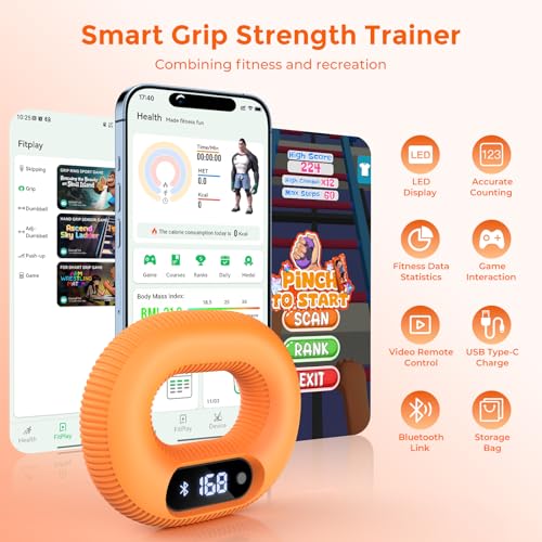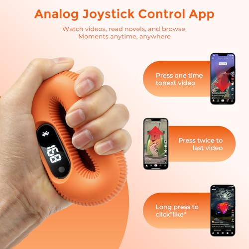BLUETOOTH CONNECTION AND REMOTE CONTROL – The smart grip trainer can connect Bluetooth to control short video platforms, e-books, and interactive games—hands-free. Press once, the screen slides down; Press twice and slide on the screen. Turn screen time into active, stress-relieving exercise. The companion app tracks your workout data, helping you monitor progress over time