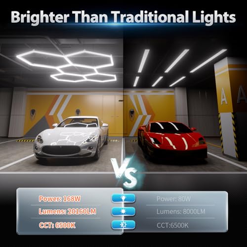 ENERGY SAVING & SAFETY – Hexagon garage lights use high-efficiency LED chips and energy-saving power supplies. The light efficiency is as high as 120LM/W, total power of 168W can emit 20,160LM of light, which saves more than 95% of energy than traditional lamps. The lampshade is made of optically designed fireproof PC material with good flame retardant performance. Integrated housing with no exposed wires to avoid leakage and is safer