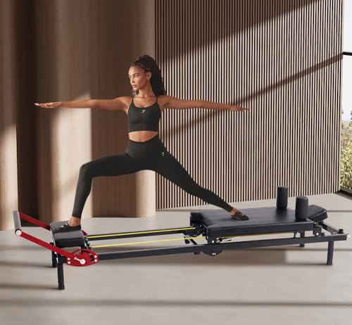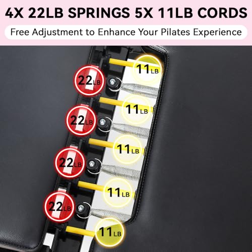 [Your Home Pilates Solution] This new stylish home gym Pilates reformer machine allows you do Pilates exercise workout at any place and any time without costly Pilates Studio membership fees.[Robust Construction] Built with heavy-duty steel frame supporting up to 330 lbs weight capacity for stable and secure workouts[Adjustable Resistance] Features 5 resistance cords (11lbs each) and 4 springs (22lbs each) to accommodate different fitness levels and exercises[Comprehensive Workout] Helps sculpt muscles, improve core strength, enhance flexibility, and refine posture through various Pilates exercises[Space-Saving Storage] Quick-assembly design with foldable functionality makes it convenient to store when not in use