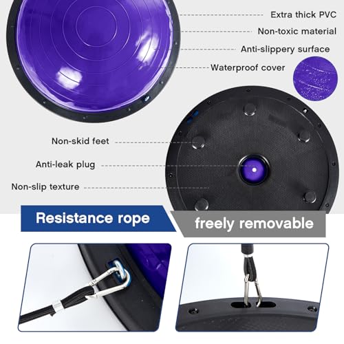 Sturdy and Reliable: the purple half exercise ball is made of PVC material, reliable and serviceable, and can support up to 880 pounds, with a large size of about 18 inches, comfortable for exercise; In addition, the top and bottom are designed with non slip texture surface, so that sweaty hands and feet can stay still and do not slide when training