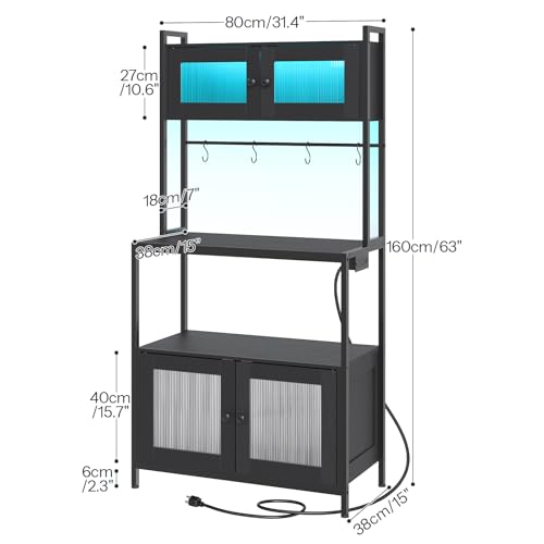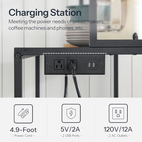 Power Station & LED Light Strip: The bakers rack with power outlet has 2 AC outlets and 2 USB ports, allowing you to charge your phone, tablet, or other devices while using your microwave. The light strip has 28 colors, 10 brightness levels and 10 modes, so you can create the perfect lighting ambiance for your baking sessions