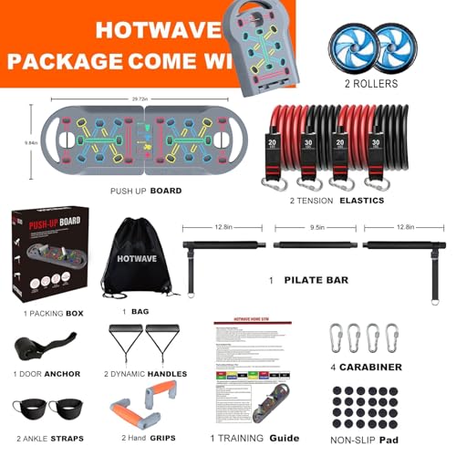 【ALL IN ONE HOME WORKOUT EQUIPMENT SYSTEM】HOTWAVE Portable Exercise Pack is used with various workout equipment attachments:foldable Pushup board,3-section Bar,4 Resistance Bands, 2Ankle Strap,door nachor,Ab roller wheel,which can fulfill most of your workout needs in the gym