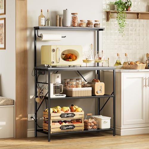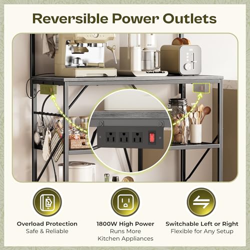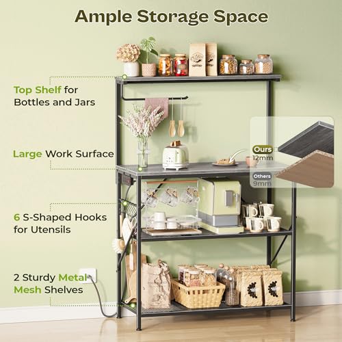 Huuger 4-Tier Bakers Rack with Reversible Power Outlet, 31.5 Inch Microwave Stand, Kitchen Coffee Bar, with Top Shelf, 6 S Hooks, Grey