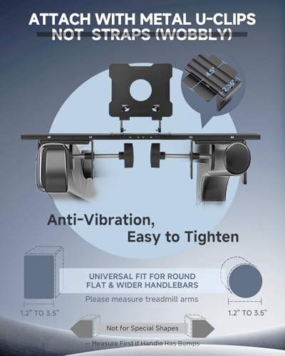 An Unique Sturdiness Ensurance: Universal metal U-shape clips, apply on round (1.2″-3.5″) and flat (1.2″-3.5″) handlebar. An slim 2.36″ cross bar maximize the “useful area” between two treadmill arms. Just fold up the tray then ready for a no impedes running.