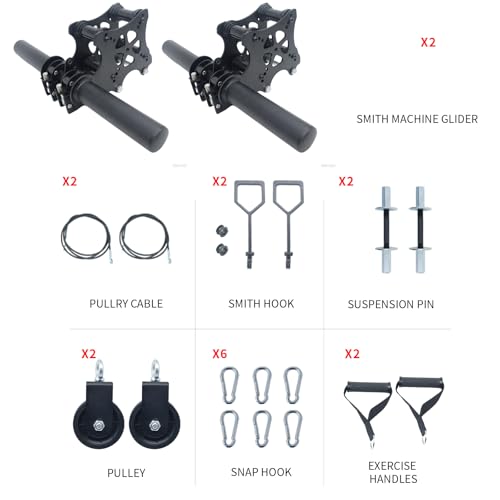 【Included Components】2 × smith machine glider / 2 × barbell / 2 × pulley cable / 2 × pulley / 2 × exercise handles / 6 × snap hook / 2 × smith hook / 2 × suspension pin. Note: Along with the entire tools mentioned above, the other exercise tools in the picture are only for display purposes.