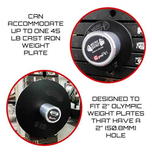 Extra Weight: The weight loading pin body is made from Aluminum that is 3-1/8″ in length; The Micro Gainz GymPin can accommodate up to one 45 lb Olympic weight plates depending on plate thickness