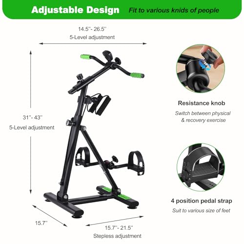 Flexible Adjustment: Equipped with 5-level height adjustment for the handlebar and center pillar, with a total height range of 31”to 43”, the base also supports stepless length adjustment from 15.7” to 21.5”, making it suitable for users of all body types. Moreover, the tension on both the handles and pedals can be easily adjusted by turning the knob to meet your needs for both general exercise and rehabilitation training.