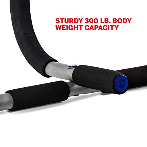 Portable gym that can be used as a doorway pull up bar or for sit-ups, push-ups, and dips; 300-pound weight capacity