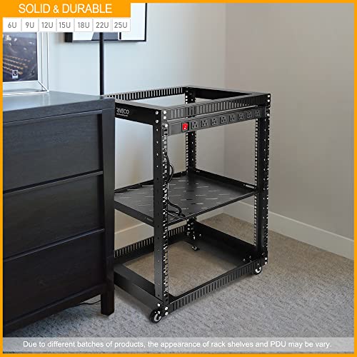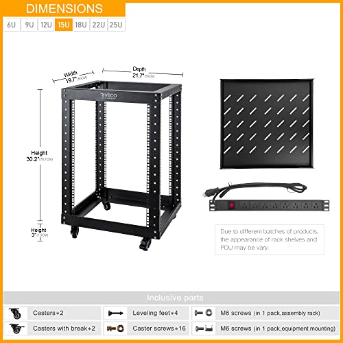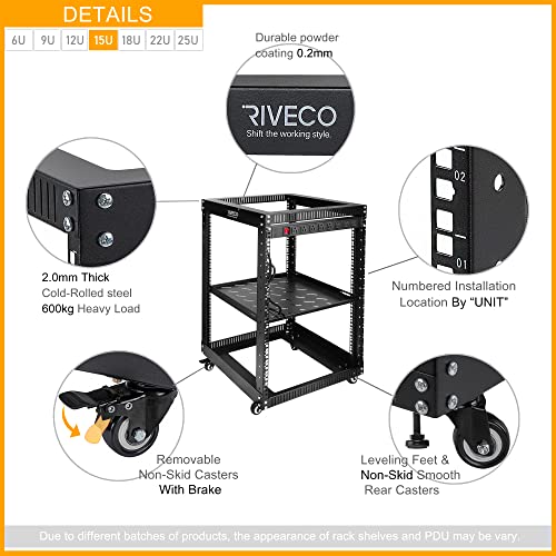 RIVECO 15U 19 Inch Open Frame Server Rack with Wheels Including 1U Rack Shelf & Power Strip Universal for 19″ Network Equipment Black