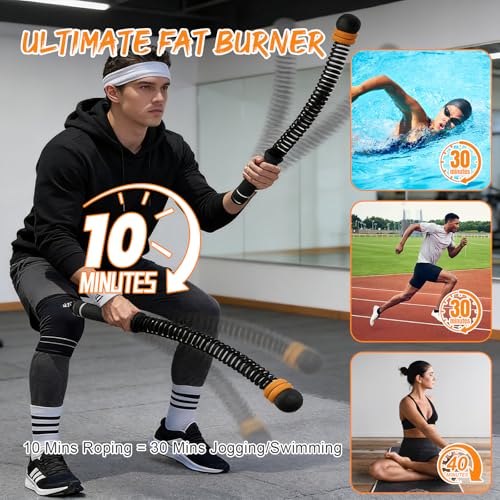 MAXIMUM EFFICIENCY WORKOUT.Achieve your fitness goals faster with our cordless battle ropes. Just 10 minutes of whipping equals 30 minutes of jogging or swimming. Equipped with thickened, weighted springs, these workout ropes provide dynamic resistance to rapidly activate core muscles and arms. Ideal fitness equipment for high-intensity interval training (HIIT) to shred fat and build lean muscle in less time.
