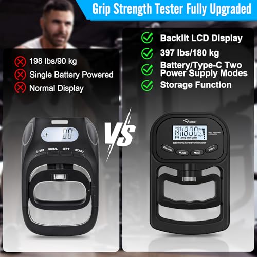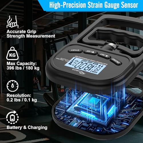 Ryaco Grip Strength Tester With Adjustable Hand Gripper, 396lbs/180kg Digital Hand Dynamometer Grip Strength Trainer Set Electronic Hand Grip Strengthener with LCD Display for Rehab Fitness Home Use