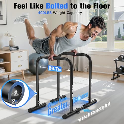 【BUILT TO LAST WITH 2MM THICKENED STEEL】Made from heavy-duty steel, the dip station offer impressive durability and can support up to 400 lbs. It is designed for users of all body types and strength levels, ensuring long-term use without worrying about wear and tear or malfunction.