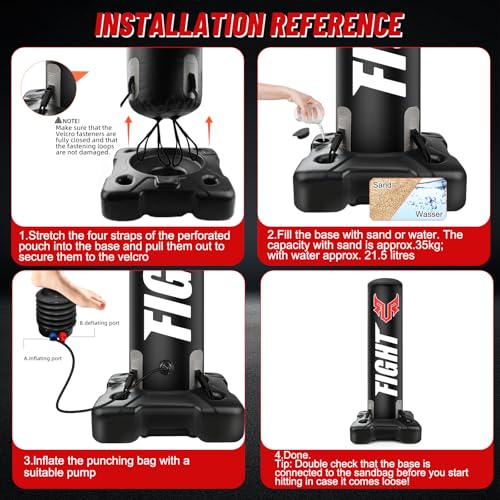 Easy to Use: Simply fill the base of the boxing heavy bag with water or sand or both, then inflate the body parts with the air pump, then you can get a sturdy stand up punching bag.