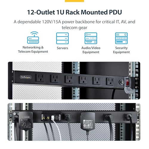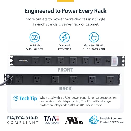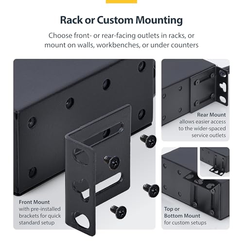 Deliver consistent power to critical equipment in server rooms, AV racks, and test benches. This 1U rackmount PDU features 12 NEMA 5-15 right-angle outlets with generous spacing for oversized adapters, a built-in circuit breaker, and versatile mounting options, making it a dependable power backbone for critical deployments. Designed for dense IT and AV environments, this unit powers up to 12 devices through 6x front and 6x rear-facing NEMA 5-15 outlets. The right-angle ports create a 2-inch (5.1cm) spacing between outlets letting you accommodate oversized plugs without blocking neighboring outlets. The integrated 15A circuit breaker helps offer protection to connected equipment by automatically cutting power if the total current draw exceeds protected operating limits. The illuminated power switch makes it easy to make sure power status at-a-glance, even in dimly lit environments, and has a protective cover to help prevent accidental shutdowns right through day by day tasks around the connected equipment. Power delivery unit is TAA-compliant and includes 4-way mounting brackets that provide flexible mounting options. The PDU is compatible with standard 19″ EIA-310 racks that are no less than 4in (10.1cm) deep and is constructed from durable, powder-coated SPCC steel for long-term reliability. Additionally, the built-in 8ft (2.4m) power cord provides the flexibility and reach needed to accommodate more than a few configurations.