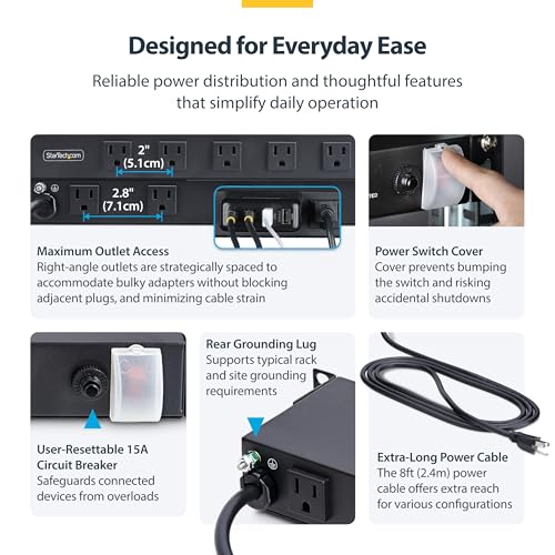 MAXIMIZE OUTLET ACCESS: Right-angle NEMA 5-15 outlets prevent bulky adapters from blocking adjacent plugs, reduce cable strain, and support clean routing along the side of the rack; Built-in 8ft (2.4m) power cord easily reaches distant AC outlets
