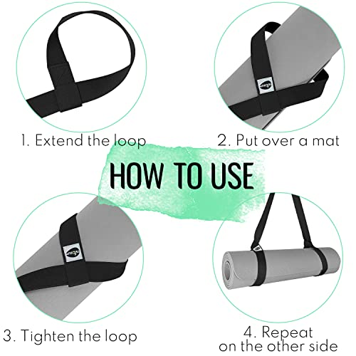 EASY TO USE: Strap is probably the most convenient way for carrying the mat, keeping it rolled in and secured in place. It fits any mat size and is simple use. There are two adjustable loops on both ends of the sling that may be loosen or tighten to adjust to the desired size. It allows to carry your mat for your yoga, fitness, Pilates classes and not using a bulky bag and to stay totally hands-free.