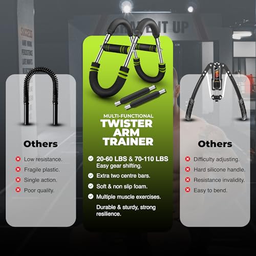 [ Full Upper-Body Workout ] – Build chest, arms, shoulders, back, and core with this Twister Arm Trainer for Men. Use as an arm blaster, chest press, or chest fly machine for complete muscle sculpting.[ 12-Level Adjustable Resistance ] – Train smarter with 4 springs offering 20–110 lbs resistance. This adjustable twister arm workout bar suits beginners to advanced lifters for lasting progress.[ Heavy-Duty & Ergonomic Design ] – Built with reinforced steel springs, non-slip foam grips, this arm exercise equipment ensures safe, stable, and wrist-friendly training sessions.[ Portable Home Gym Trainer ] – Replace bulky gear with this compact chest workout equipment. Use it as a chest trainer alternative at home, office, or outdoors. Fits easily in a gym bag.[ Versatile Strength & Endurance Tool ] – Boost push-up power, posture, and shoulder stability. This gorilla bar chest trainer doubles as an arm exerciser and chest trainer for fast, visible results.