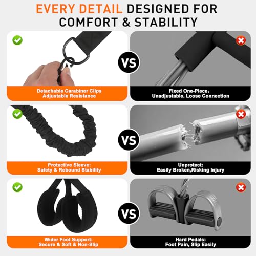 Upgraded Foot Pedals – Comfortable Even Barefoot: Compared with 6 tube tension rope with hard pedals, the wide foot pedals are made with durable nylon fabric, offering excellent strength, breathability. The soft, cushioned surface of foot pedal resistance band reduces pressure on feet, while the non-slip design improves stability during sit-ups, stretching and lower-body training. The wider, thicker ab workout equipment provides soft, airy comfort whether you’re in sneakers or barefoot.