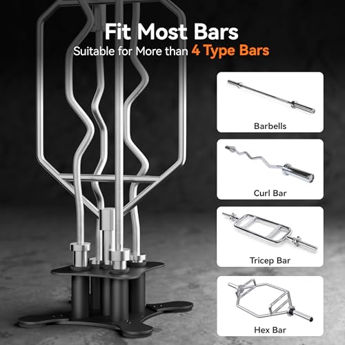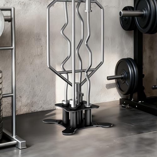 House-Saving Barbell Storage – Vertical bar rack holds 5 Olympic barbell holders (2-inch diameter: hex bar, curl bar) – compact Flooring footprint, litter-free.​