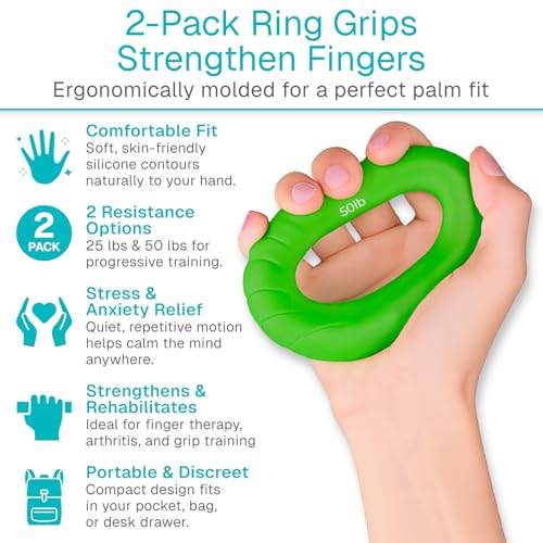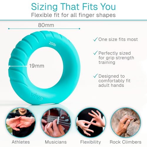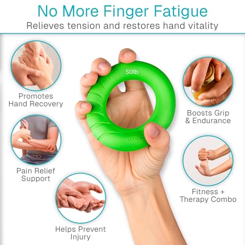 DUAL RESISTANCE LEVELS FOR TARGETED IMPROVEMENT Tailor your training with the Vive Ring Grips, offering two progressive resistance levels of 25 and 50 pounds. Ideal for those with carpal tunnel, arthritis, or tendonitis, these grips effectively bolster wrist and hand muscles, offering relief from pain and stiffness. The Vive Ring Grips are great for a variety of individuals, including musicians, athletes, climbers, or those dealing with post-injury or post-surgery recovery