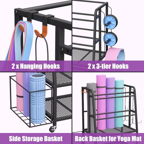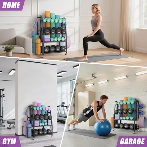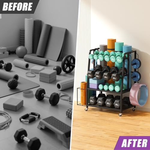 Complete Home Gym Organization in One Unit: Tired of workout clutter? This home gym storage system goes beyond a basic dumbbell rack stand only. It features: a dedicated rear slot for yoga mats, a side mesh basket for foam rollers, two spacious platform shelves for kettlebells/medicine balls, plus multiple hooks for resistance bands and accessories. Everything has its place, making gym organization for home gym effortless.