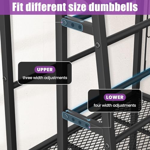 Precision Adjustable Dumbbell Storage System: Unlike fixed-width racks, this dumbbell rack features a hole-position adjustment mechanism that lets you customize the spacing between round steel tubes. First tier offers 3 width settings (90/115/145mm), second tier provides 4 settings (90/115/145/175mm) to accommodate various dumbbell grip widths. Each weight sits securely without rolling, giving you a truly customized weight rack for home gym dumbbells.
