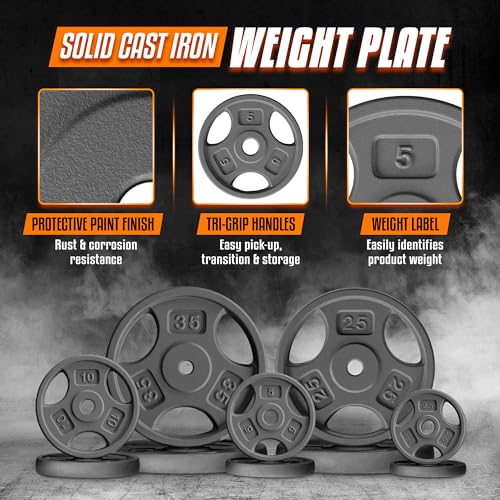 DURABLE CONSTRUCTION: Made from high-quality cast iron for long-lasting use; Weight plates have 1 inch hole, just suitable for 1″ standard weightlifting bars, great for building strength, muscle; Includes options from 2.5 lb plates to 35 lb